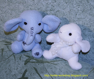 Вот такие малыши получились))) Слоник ростом 16 см, набит синтепухом, лапки на пуговичном креплении. Зайчик ростом 12 см, нибит тоде синтепухом, голова крутиться, а лапки гнуться (внутри проволока).